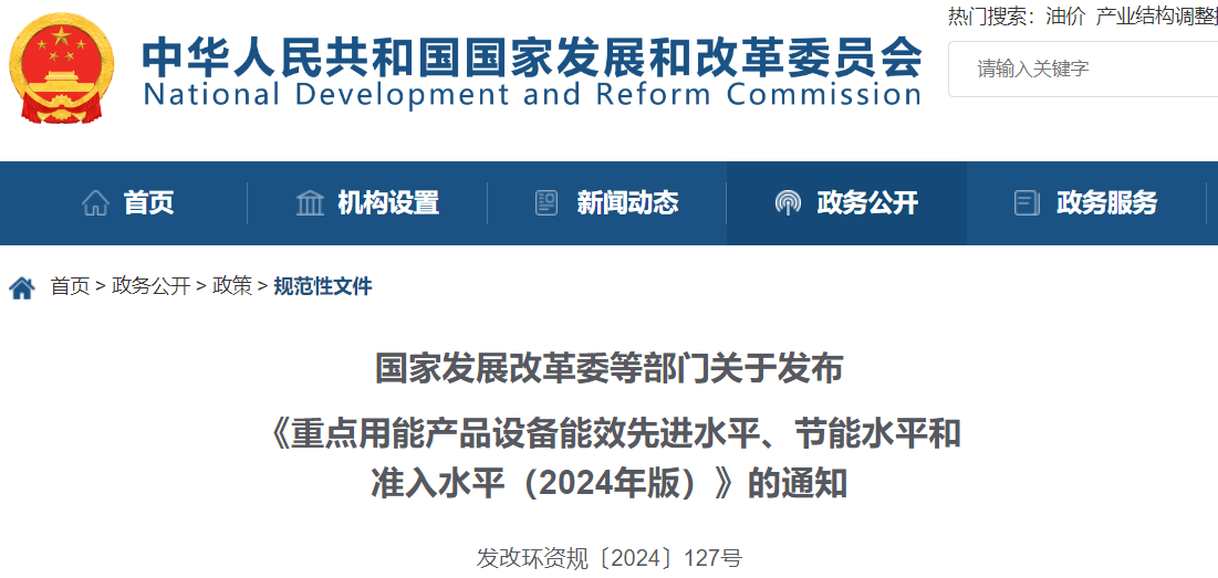 國家發(fā)改委等部門關(guān)于發(fā)布《重點(diǎn)用能產(chǎn)品設(shè)備能效先進(jìn)水平、節(jié)能水平和準(zhǔn)入水平(2024年版)》的通知