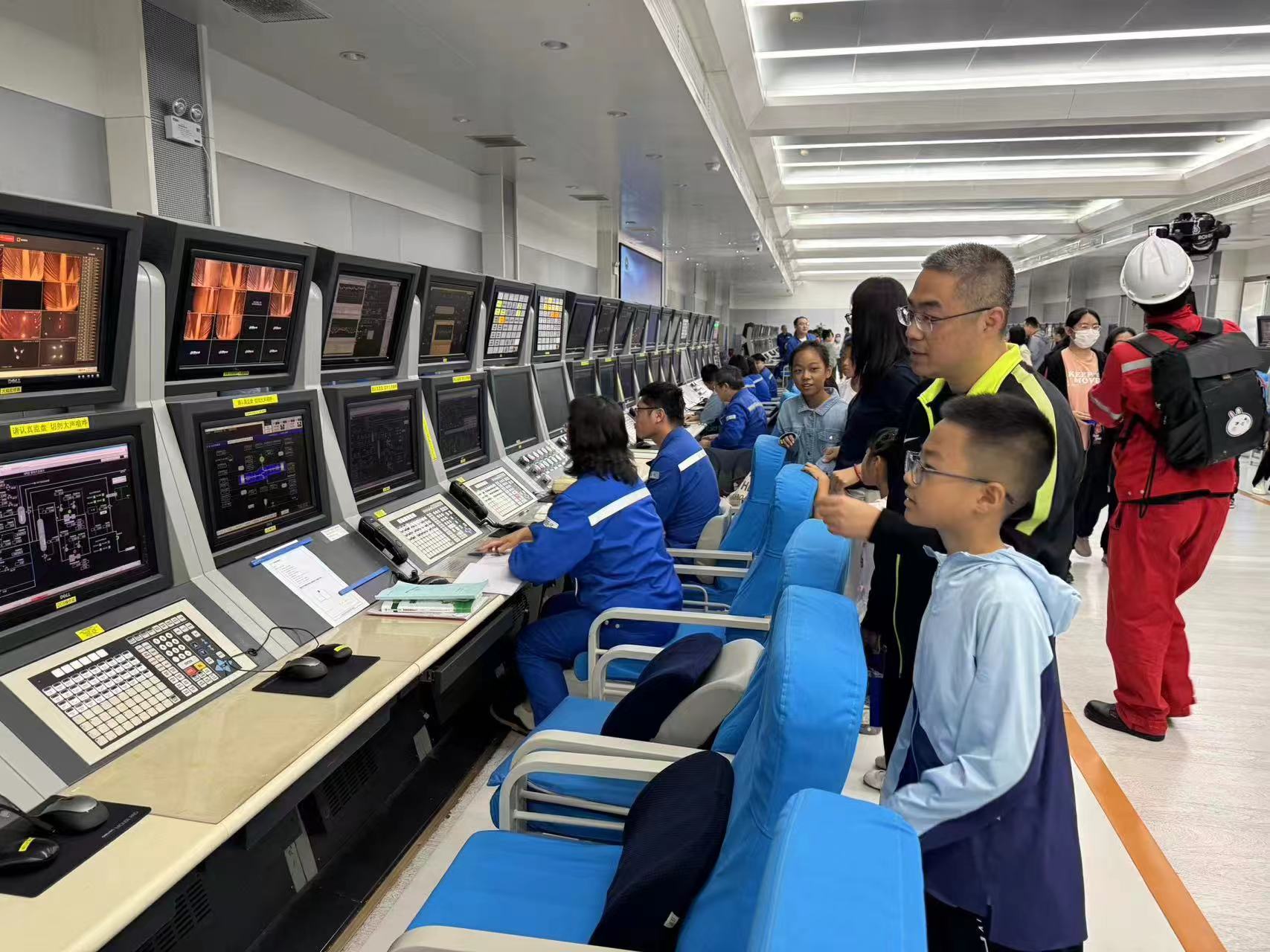 圖為職工子女與家長(zhǎng)一同參觀煉化裝置中央控制室。(記者曲照貴 攝)
