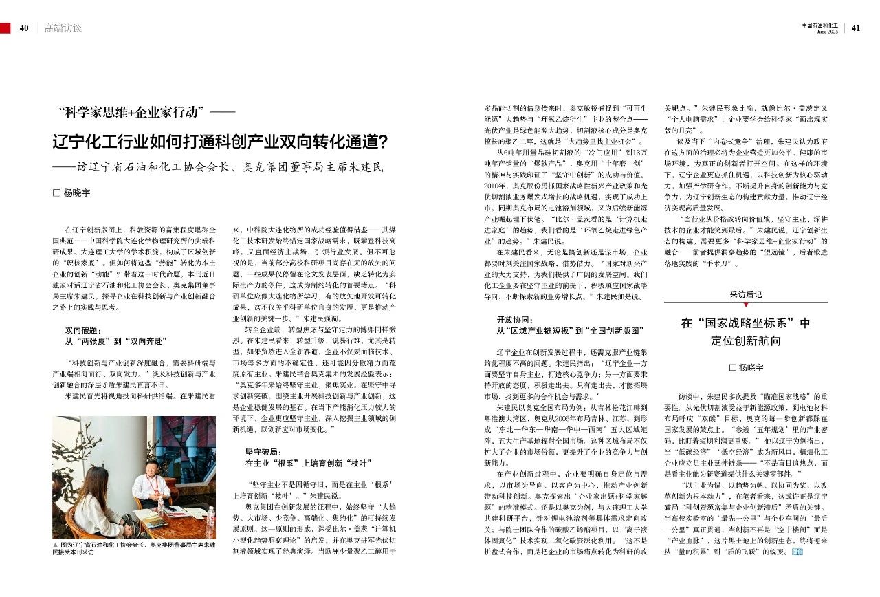 在遼寧創(chuàng)新版圖上,科教資源的富集程度堪稱全國典范——中國科學院大連化學物理研究所的尖端科研成果、大連理工大學的學術積淀,構成了區(qū)域創(chuàng)新的“硬核家底”。但如何將這些“勢能”轉(zhuǎn)化為本土企業(yè)的創(chuàng)新“動能”?帶著這一時代命題,本刊近日獨家對話遼寧省石油和化工協(xié)會會長、奧克集團董事局主席朱建民,探尋企業(yè)在科技創(chuàng)新與產(chǎn)業(yè)創(chuàng)新融合之路上的實踐與思考。