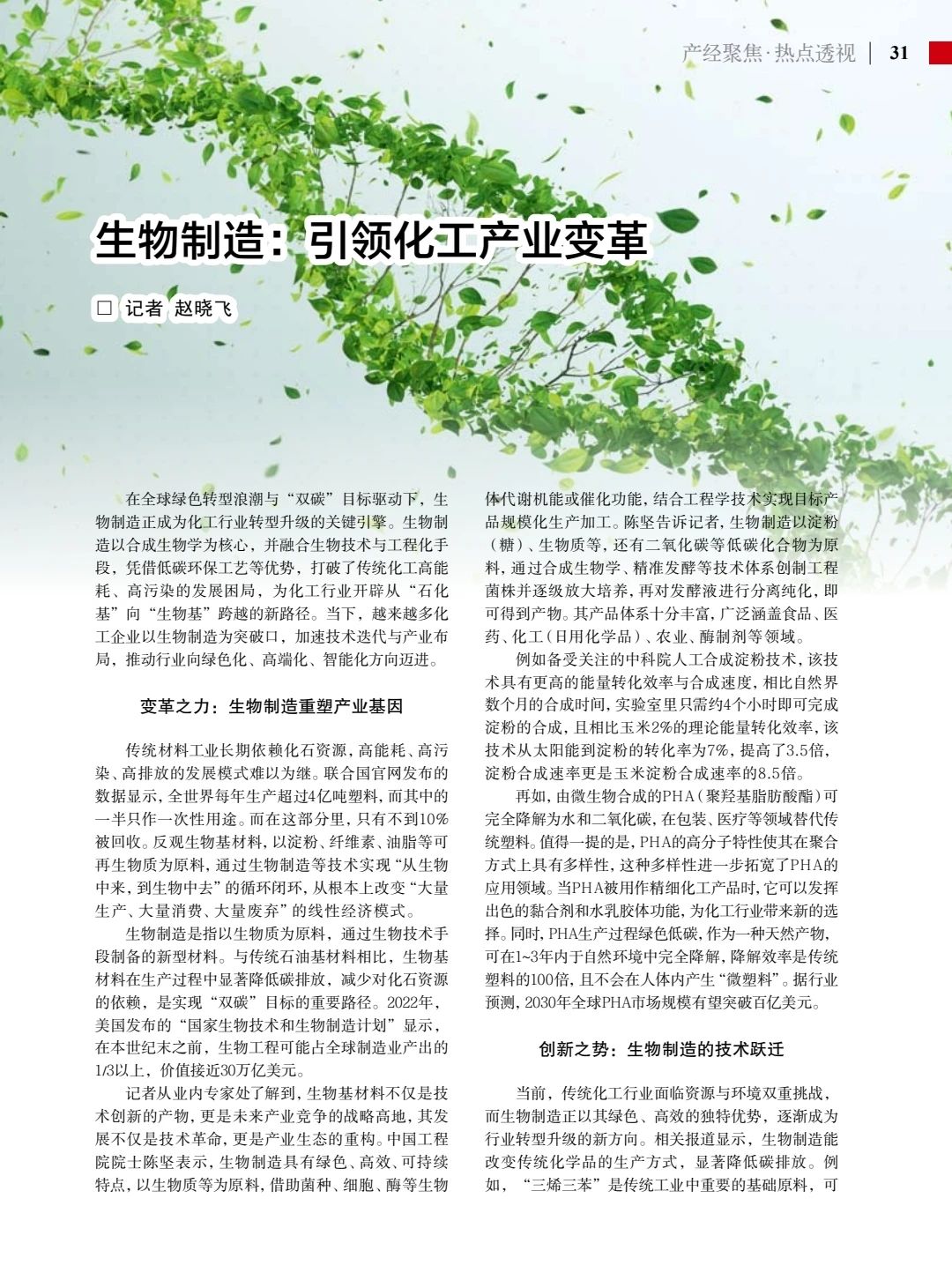 記者了解到,隨著生物技術(shù)的迅猛發(fā)展,生物制造從實驗室走向大規(guī)模工業(yè)化應(yīng)用,開始重塑化工產(chǎn)業(yè)格局。不少傳統(tǒng)化工企業(yè)紛紛投身生物制造領(lǐng)域,通過技術(shù)創(chuàng)新與跨界合作,探索可持續(xù)發(fā)展的新路徑,在傳統(tǒng)與創(chuàng)新的交融中,開啟化工行業(yè)發(fā)展新篇章。