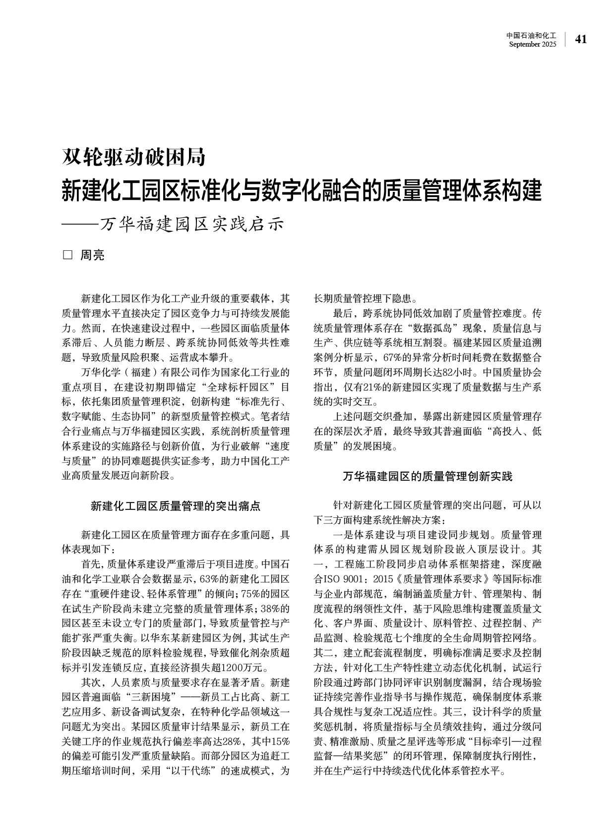 雙輪驅(qū)動破困局新建化工園區(qū)標(biāo)準(zhǔn)化與數(shù)字化融合的質(zhì)量管理體系構(gòu)建——萬華福建園區(qū)實踐啟示