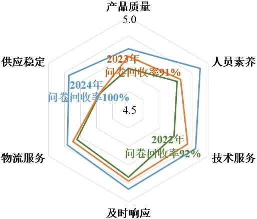 通過構(gòu)建全鏈條質(zhì)量管理體系,萬華福建園區(qū)在客戶滿意度方面實現(xiàn)顯著突破(如圖1)。產(chǎn)品質(zhì)量維度從4.72分提升至4.83分,人員素養(yǎng)、技術(shù)服務(wù)與及時響應(yīng)均突破4.90分高位。值得注意的是,2024年問卷回收率達(dá)100%,反映出客戶參與意愿的增強(qiáng)。多維指標(biāo)的系統(tǒng)性提升印證了“質(zhì)量前移”策略的有效性。