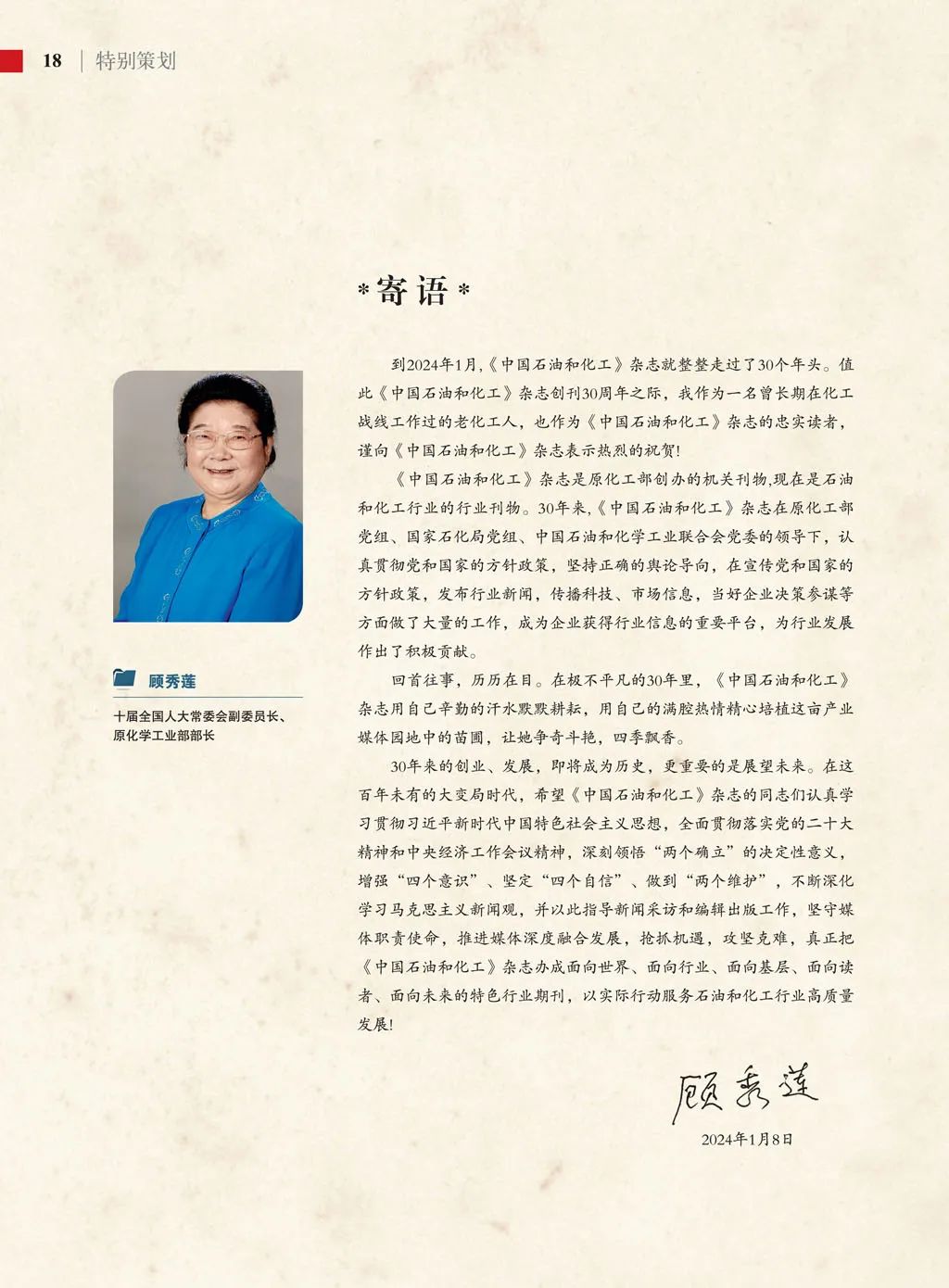 顧委員長為《中國石油和化工》雜志創(chuàng)刊30周年撰寫寄語。文章刊登于2024年1月刊。