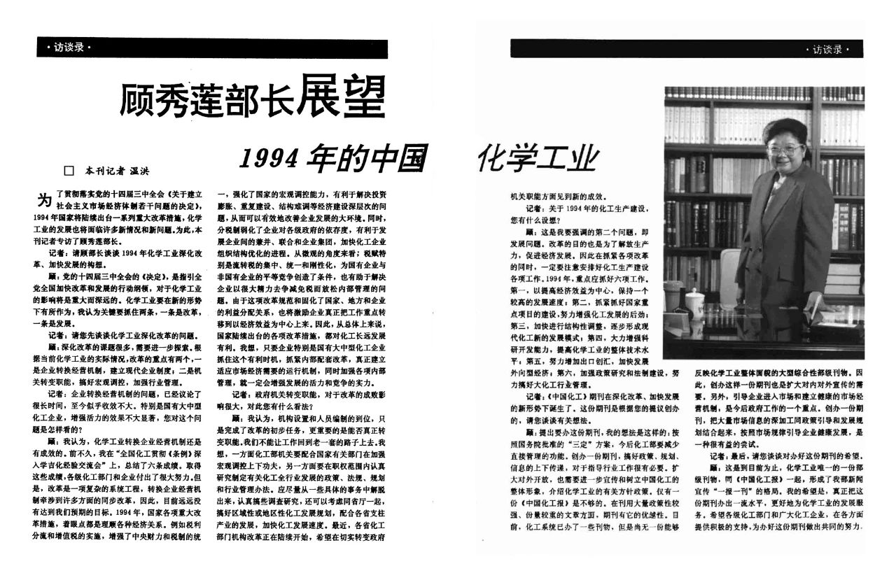 1994年,《中國石油和化工》雜志創(chuàng)刊。時任化工部部長顧秀蓮接受了本刊記者的采訪,展望當(dāng)年中國化學(xué)工業(yè)。