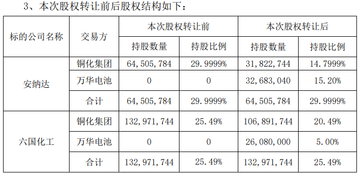 2月27日,萬華化學、六國化工、安納達三家公司同時發(fā)布公告,萬華化學不再受讓銅化集團部分股份,而是通過萬華化學全資子公司,直接受讓安納達及六國化工的部分股權,其中安納達仍將實現實控人變更,但收購六國化工的股權比例僅為5%,無法對六國化工形成控制。