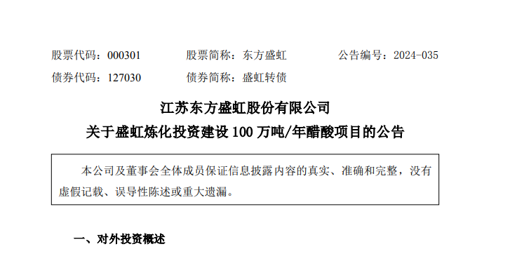 4月25日,東方盛虹發(fā)布公告稱,江蘇東方盛虹股份有限公司的二級(jí)全資子公司盛虹煉化(連云港)有限公司擬投資建設(shè)“100萬(wàn)噸/年醋酸項(xiàng)目”。項(xiàng)目預(yù)計(jì)總投資38.52億元,建設(shè)期為2年。