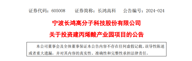 長鴻高科4月29日晚間公告,公司擬在廣東省茂名市濱海新區(qū)投資建設新項目“丙烯酸產業(yè)園項目”,項目總投資約115億元。長鴻高科稱,該項目將顛覆性地以丙烷為原料直接氧化生產中間產品丙烯酸,再采用酯化、聚合工藝生產高附加值的丙烯酸酯及SAP產品,符合新質生產力的發(fā)展要求。