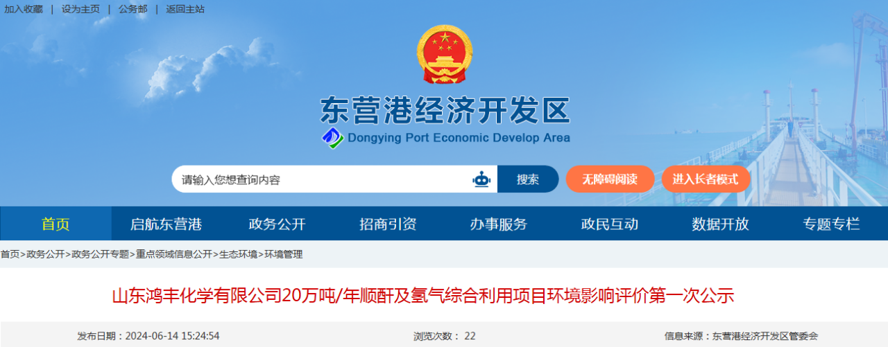 2023年10月7日,東營港經(jīng)濟(jì)開發(fā)區(qū)對山東鴻豐化學(xué)有限公司20萬噸/年順酐及氫氣綜合利用項目進(jìn)行社會穩(wěn)定風(fēng)險分析信息公示。