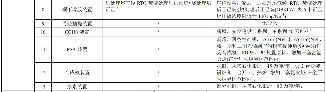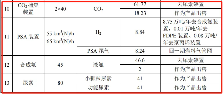 如下表為各裝置具體生產(chǎn)規(guī)模及產(chǎn)品方案,明顯可以看到,變更后的方案增加了CO2捕集、PSA等裝置。