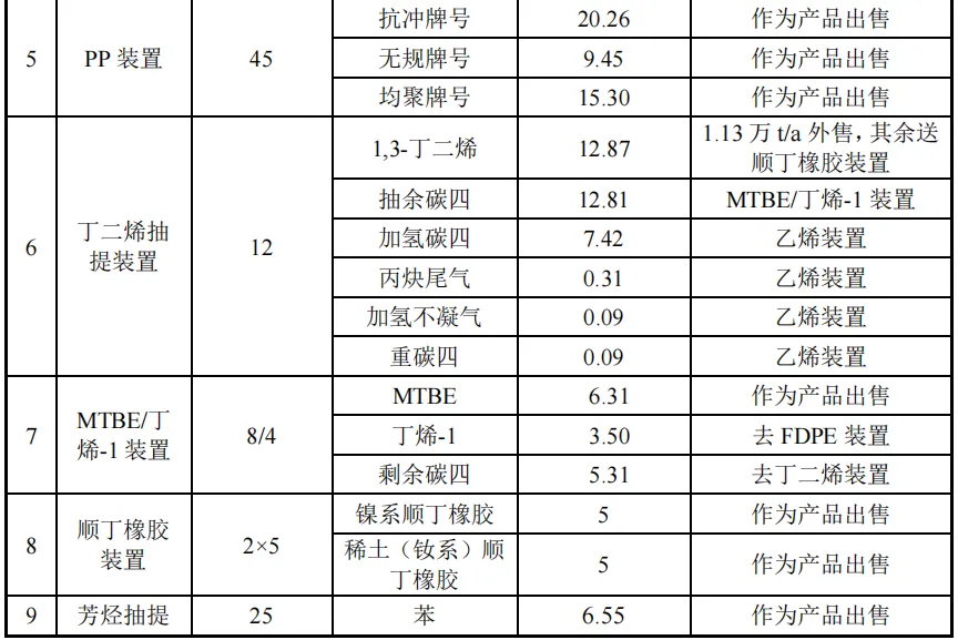 項(xiàng)目包括13套主體裝置,主要產(chǎn)品為HDPE、LLDPE、LDPE、EVA、PP、順丁橡膠、MTBE、裂解C5、苯、甲苯、混二甲苯、乙烯焦油和尿素,副產(chǎn)聚乙烯蠟、丁二烯、C9+、CO2和液氨等。