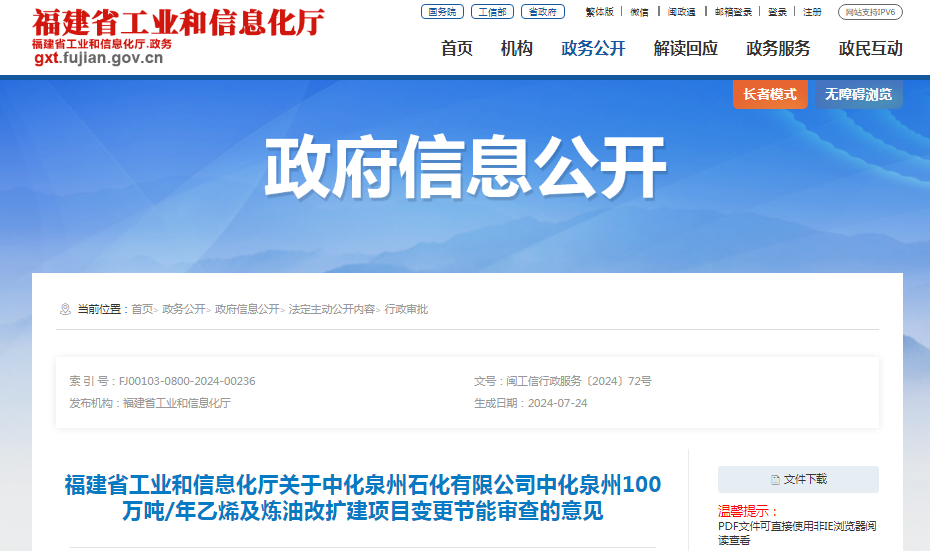 7月31日,福建省工業(yè)和信息化廳發(fā)布關(guān)于中化泉州石化有限公司中化泉州100萬(wàn)噸/年乙烯及煉油改擴(kuò)建項(xiàng)目變更節(jié)能審查的意見(jiàn)。