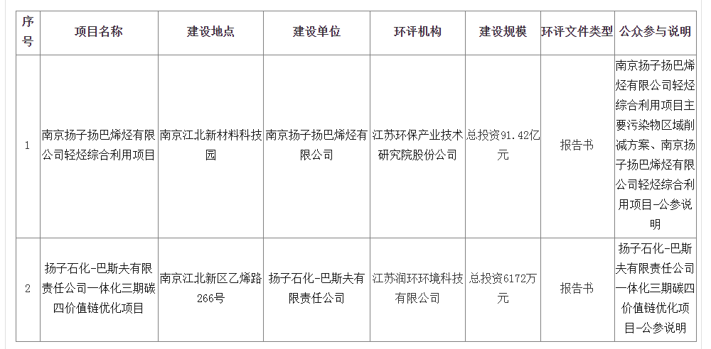 2024年8月7日,南京江北新區(qū)行政審批局發(fā)布受理南京揚子揚巴烯烴有限公司輕烴綜合利用項目和揚子石化-巴斯夫有限責任公司一體化三期碳四價值鏈優(yōu)化項目公示:
