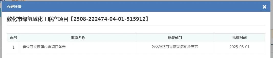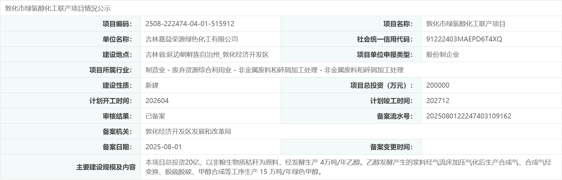 8月1日,吉林省敦化市綠氫醇化工聯(lián)產(chǎn)項目獲備案。
