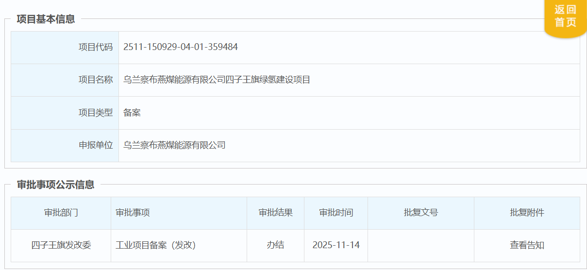 11月14日,內(nèi)蒙古自治區(qū)投資項(xiàng)目在線審批辦事大廳相關(guān)信息顯示:烏蘭察布燕煤能源有限公司提交的烏蘭察布燕煤能源有限公司四子王旗綠氫建設(shè)項(xiàng)目,符合產(chǎn)業(yè)政策和市場準(zhǔn)入標(biāo)準(zhǔn),正式準(zhǔn)予備案。
