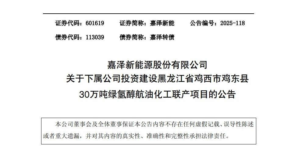 12月14日,嘉澤新能發(fā)布公告稱(chēng),為滿(mǎn)足公司生產(chǎn)經(jīng)營(yíng)和發(fā)展戰(zhàn)略的需要,上海嘉益榮源全資子公司黑龍江嘉益榮源綠色化工有限公司(以下簡(jiǎn)稱(chēng)“黑龍江嘉益榮源”)擬采用自有和向金融機(jī)構(gòu)融資等方式籌措資金,投資建設(shè)黑龍江省雞西市雞東縣30萬(wàn)噸綠氫醇航油化工聯(lián)產(chǎn)項(xiàng)目,上述綠氫醇項(xiàng)目計(jì)劃總投資約355,660.38萬(wàn)元。
