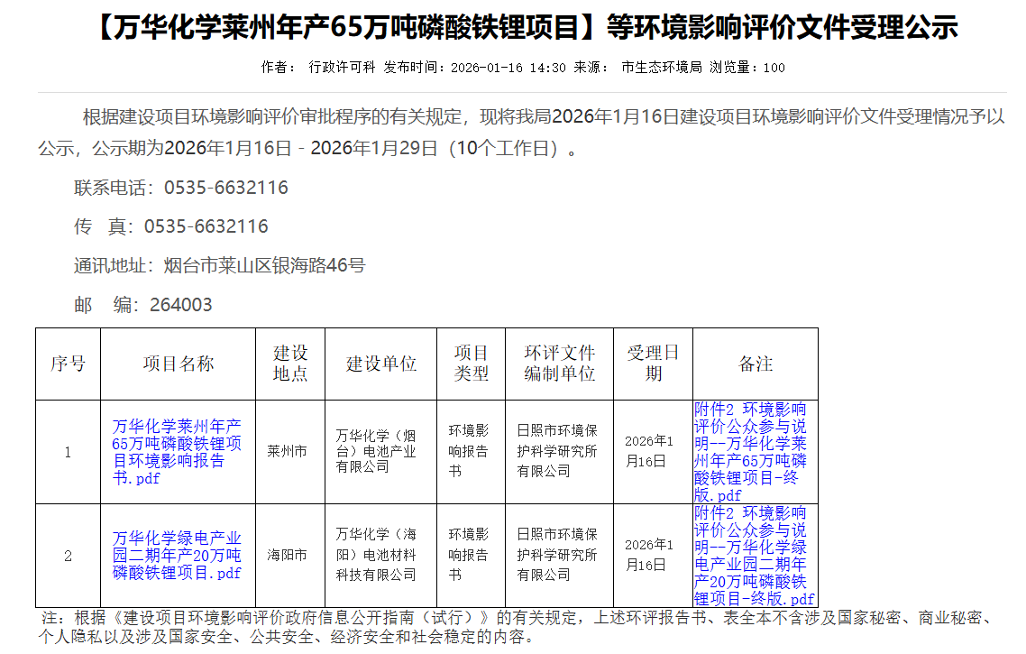 1月16日,萬華化學(xué)萊州年產(chǎn)65萬噸磷酸鐵鋰項(xiàng)目、綠電產(chǎn)業(yè)園二期年產(chǎn)20萬噸磷酸鐵鋰項(xiàng)目環(huán)境影響評(píng)價(jià)文件在山東省煙臺(tái)市生態(tài)環(huán)境局受理公示。