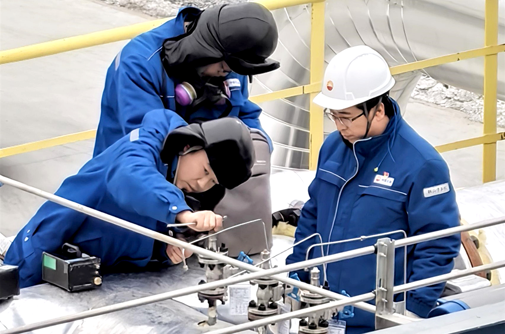 1月1日,B套單元正式啟動裸冷作業(yè)——這是檢驗設(shè)備低溫密封性、結(jié)構(gòu)強度及安裝精度的核心環(huán)節(jié),直接影響裝置后續(xù)能否穩(wěn)定運行。當(dāng)時施工現(xiàn)場氣溫驟降,作業(yè)空間狹小,給裸冷作業(yè)帶來多重考驗。“再仔細檢查一遍密封件,絕不能留任何隱患!”現(xiàn)場指揮員的喊聲穿透寒風(fēng),作業(yè)人員身著厚重防寒服,在狹窄空間內(nèi)精準操作,緊盯設(shè)備各項參數(shù)。經(jīng)過24小時連續(xù)奮戰(zhàn),裸冷任務(wù)順利完成。團隊馬不停蹄投入冷緊、復(fù)溫冷箱干燥等工作,以高效執(zhí)行力筑牢裝置安全運行基礎(chǔ)。