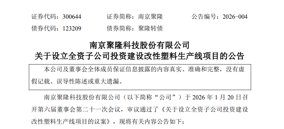 1月20日,南京聚隆發(fā)布公告稱,公司召開了第六屆董事會第二十一次會議,審議通過了《關(guān)于設(shè)立全資子公司投資建設(shè)改性塑料生產(chǎn)線項目的議案》。