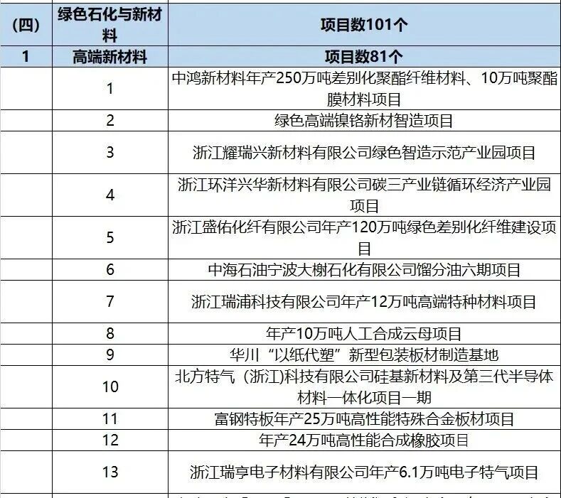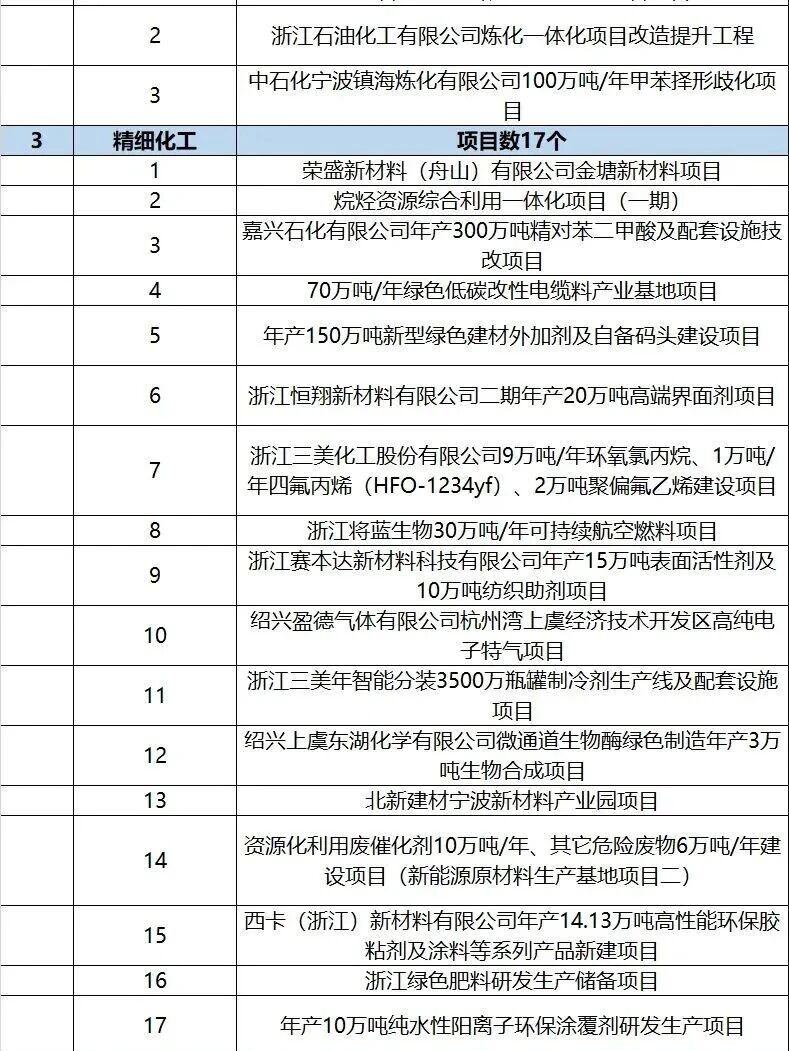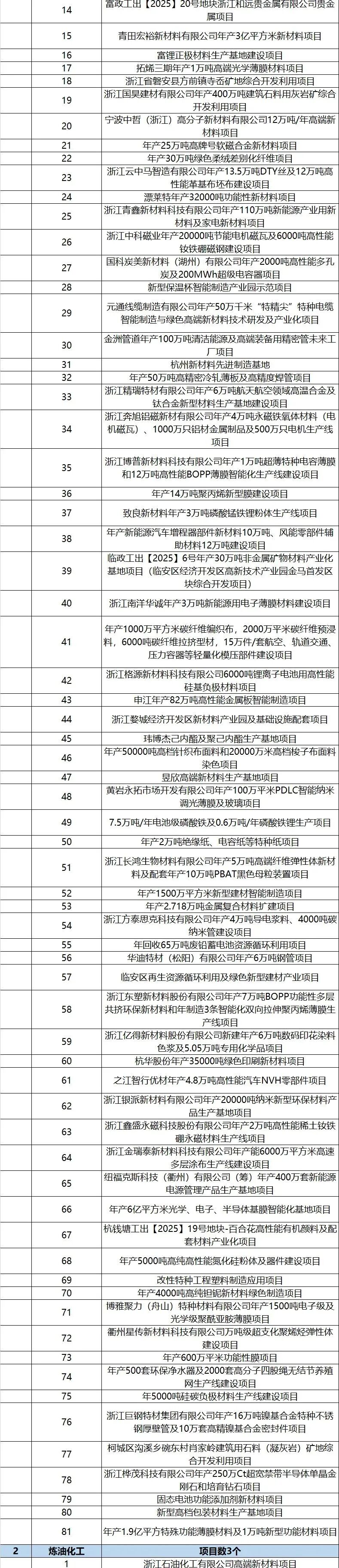 近日,浙江省發(fā)展和改革委員會公布浙江省擴大有效投資 “千項萬億”工程2026年第一批重大建設(shè)項目實施計劃項目表。綠色石化與新材料項目共101個,其中高端新材料81個,煉油化工3個,精細化工17個。